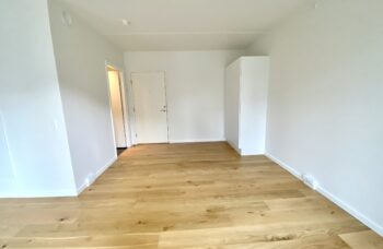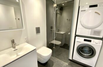 Fra opgangen går man direkte ind i lejligheden, hvor der venter et stort lyst opholdsrum med faste skab og med adgang til flot flisebadeværelse med bruseniche, væghængt toilet m.v. fra Grohe. Lækkert spejl med lys og vask med skabe fra Duravit. Der er gulvvarme, og i hjørnet i badeværelset er en skøn Sonos højtaler. Endvidere er der installeret vaskemaskine og tørretumbler fra Miele.