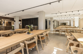 Den fælles kantine, som drives af LOCA Gruppen – altså dem med toprestauranter som Radio på Frederiksberg, Almanak i Operaen, Kilden i Tivoli, Dolores m.fl. – er smagfuldt indrettet med kvalitetsmøbler, flot udsmykning og åbent køkken.