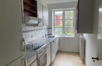 Lejligheden indeholder flot køkken med hårde hvidevarer, herunder opvaskemaskine.