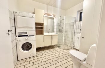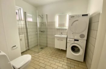 Stort flisebadeværelse med brus og egen vaskemaskine/tørretumbler.