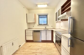 Lejligheden har godt køkken med hvidevarer og mindre spiseplads.