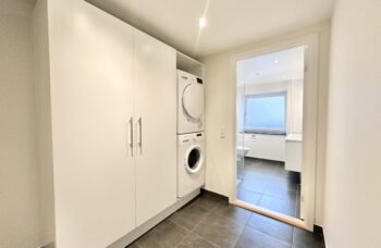 Lejligheden har adgang til stor flisebelagt entre som også fungerer som bryggers hvor der er faste skabe og vaskemaskine og tørretumbler. Der er flot flisebadeværelse med gulvvarme, væghængt toilet, bruseniche m.m.
