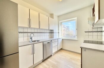 Lejligheden indeholder lækkert nyere køkken med hårde hvidevarer, herunder opvaskemaskine. Alle hvidevarer er i rustfrit stål.