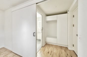 Stort soveværelse med faste skabe.
