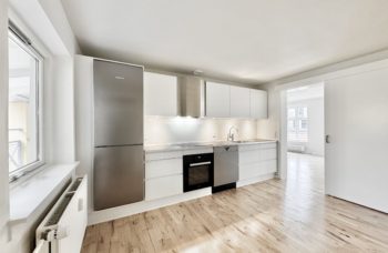Stor lys stue med udgang til altan og med adgang til flot nyt køkken med alle hårde hvidevarer, herunder opvaskemaskine.
