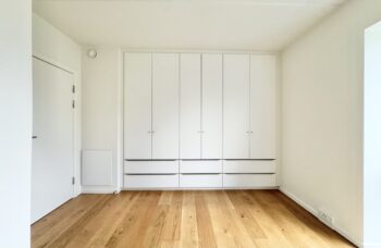 Fra entreen er der adgang til stort soveværelse, godt med høje indbyggede skabe med lys skinne.