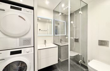 Der er lækkert badeværelse, hvor der er væghængt Grohe toilet, skab og spejl fra Duravit samt bruseniche med lækker rainshower bruser fra Grohe. Endvidere er der i badeværelset installeret vaskemaskine og tørretumbler og bluetooth højtaler fra B&O.