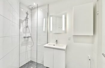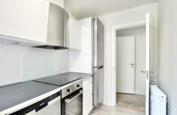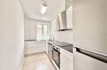Lejligheden har lækkert nyt køkken i højglans hvid, med alukanter og alt i hårde hvidevarer, herunder opvaskemaskine.