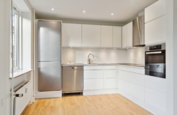 Det stilfulde nye køkken har masser af skabsplads og alle nødvendige hårde hvidevarer, herunder opvaskemaskine, som er i rustfrit stål.