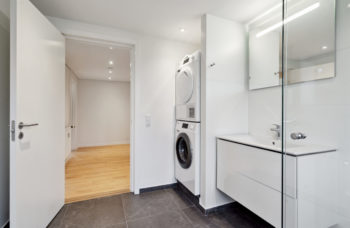 Lejligheden byder på en rummelig entré med skabe og plads til overtøj. Badeværelset er stort og moderne med bruser samt egen vaskemaskine og tørretumbler.