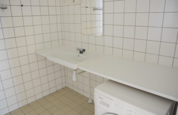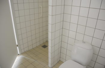 Dejligt flisebadeværelse med bruseniche og egen vaskemaskine.