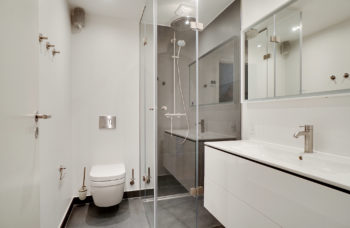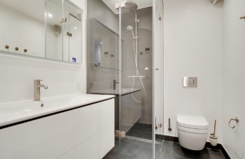 Lejligheden har mindre entré, hvorfra der er adgang til lækkert flisebadeværelse med bruseniche, væghængt toilet, B&O højtaler m.m.