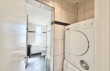 Dejligt køkken med hårde hvidevarer samt skønt badeværelse med brus og egen vaskemaskine og tørretumbler.