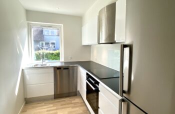 Stueplan med lyst og moderne køkken inkl. opvaskemaskine, pænt badeværelse og åben stue med direkte udgang til haven – perfekt til sommerhygge, leg eller grill.