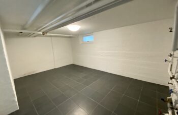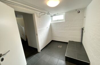 Kælder med stort viktualierum samt praktisk baderum med plads til både vaskemaskine og tørretumbler.