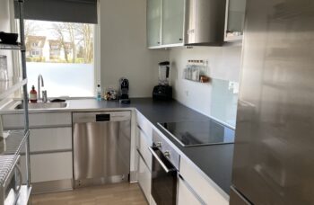 I stueplan er der badeværelse med brus. Flot køkken med alt i hårde hvidevarer, herunder opvaskemaskine. Lys stue med udgang til egen have.
