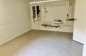 Der er fra stueplan trappe til kælderen hvor der er stort viktualierum samt mulighed for installering af vaskemaskine og tørretumbler. På 1. sal er der stort soveværelse samt mindre børneværelse.