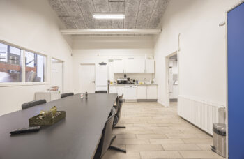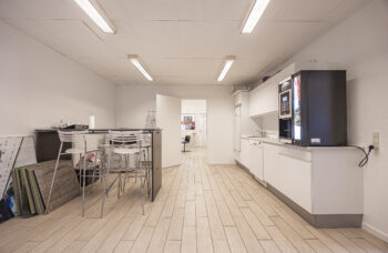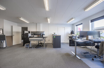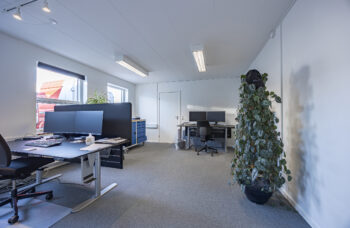 Lejemålet udgør to enheder på hver 361 m2, der er sammenlagt ved, at der er fjernet en del af væggen mellem de to lagerafsnit, samt at der er intern adgang via de to frokoststuer ved kontorafsnittene.