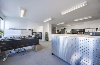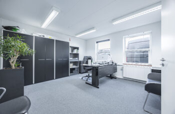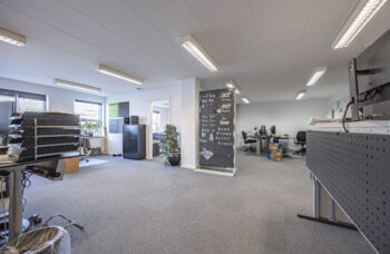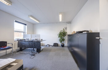 Det samlede lejemål, som udgør 722 m2, består af et storrumskontor, tre rummelige kontorer, to toiletter, to baderum, to tekøkkener/ frokoststuer/mødelokale, samt arkiv, lager, service eller montage.
