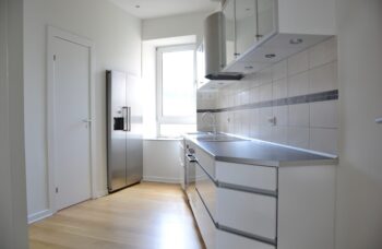 Lejligheden indeholder stort nyt og lækkert køkken med højglans elementer og alt i hårde hvidevarer herunder opvaskemaskine, indbygnings ovn og kogeplader, samt amerikansk køleskab med isterningmaskine.