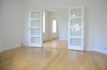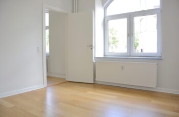 To sammenhængende lyse stuer med store flotte vindues partier, samt skønt soveværelse og godt børneværelse/kontor.