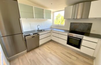 Lækkert nyt køkken med højglans elementer og rust frit stål hårde hvidevarer, samt indbyggede spots i skabe og loft samt mindre spiseplads.
