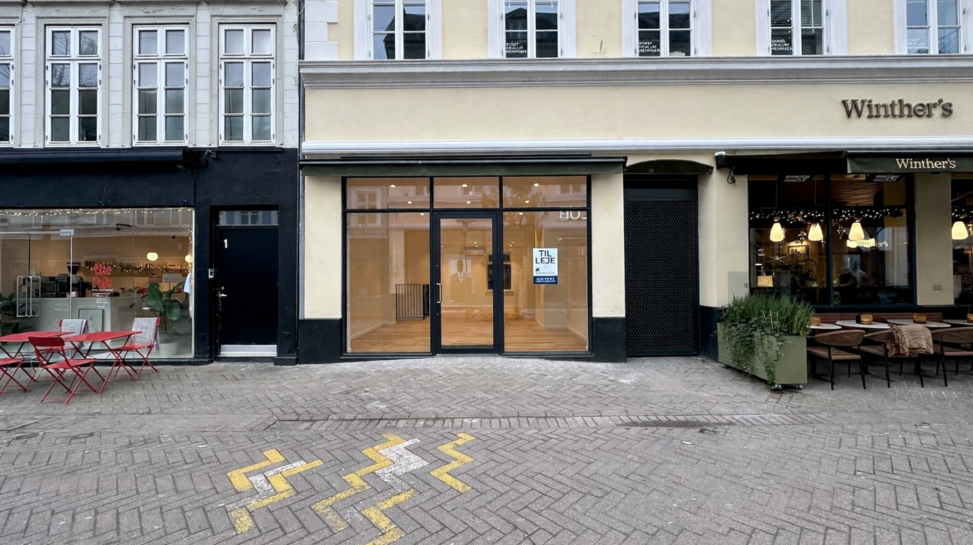 Denne butik ligger med flot, nyistandsat facade mod Kongensgade, og butikken har en stærk eksponering mod netop Kongensgade, men har også en vigtig nærhed til Vestergade, som er lige rundt om hjørnet.
